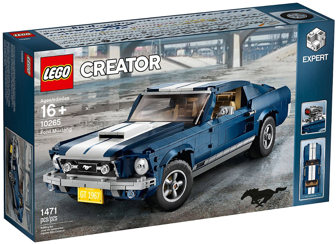 Entdecke den Zauber, der hinter dem legendären 1960er amerikanischen Muscle-Car steckt, mit dem LEGO® Creator Ford Mustang einschließlich dunkelblauer Karosserie mit weißen Rennstreifen, Lufthutze, Mustang-Abzeichen für den Kühlergrill, GT-Logos und 5-Speichen-Felgen mit straßentauglichen Reifen. Diese originalgetreue Nachbildung wurde in Zusammenarbeit mit Ford entwickelt und verfügt über zahlreiche optionale Erweiterungen zur individuellen Gestaltung wie Nummernschilder, einen Kompressor, einen Entenbürzel-Spoiler, massive Auspuffrohre, einen Frontspoiler und einen Lachgasbehälter. Sogar die Position der Hinterachse lässt sich für einen besonders dramatischen Look verstellen! Nimm das Dachelement ab oder öffne die Türen, um so auf das detailreiche Innere mit schönen Sitzen, einem Radio, einer funktionstüchtigen Steuerung und einem in der Mittelkonsole platzierten Schalthebel zuzugreifen! Verstaue Kram im Kofferraum oder öffne die Motorhaube, sodass der detailgenaue Big-Block-390-V8-Motor mit Batterie, Schläuchen und Luftfilter zum Vorschein kommt. Dieses Bauset für Fortgeschrittene vermittelt ein anspruchsvolles und lohnendes Bauerlebnis und versprüht jede Menge Nostalgie.